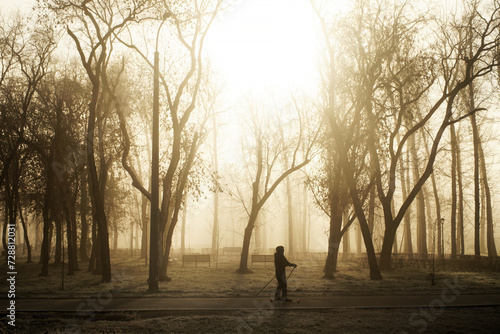 An athlete on roller skis warming up in a fall city park with morning mist, trees benches and lanterns. Photo. Contrasting natural light