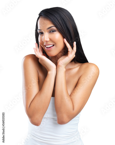 An attractive young woman with glowing soft skin isolated on a PNG background.