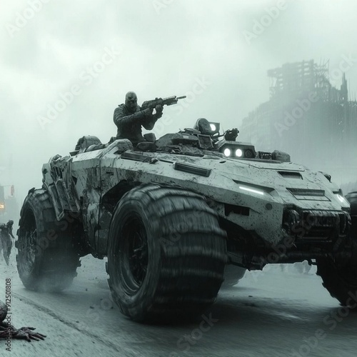 An award-winning cinematic shot of an ultra futuristic city in the post-apocalyptic cyberpunk style, a 6-wheeled all-terrain vehicle is driving on the road