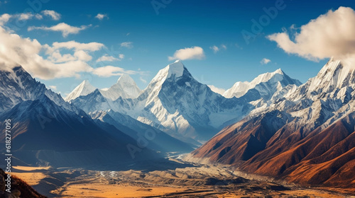 An awe-inspiring mountain range towering majestically against a clear blue sky, with snow-capped peaks piercing through the fluffy clouds Generative AI