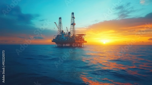 An awe-inspiring sunset illuminates an offshore oil platform while gentle waves reflect the vibrant colors of the sky