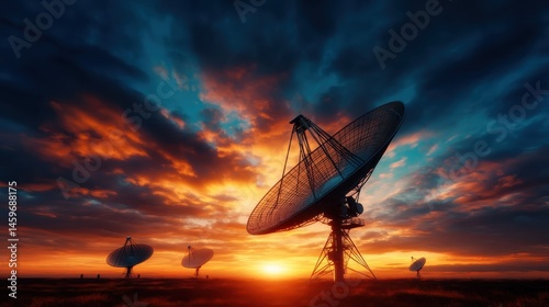 An awe-inspiring sunset view featuring a lineup of satellite dishes, merging human innovation with nature's beauty, creating a striking visual representation of both worlds.