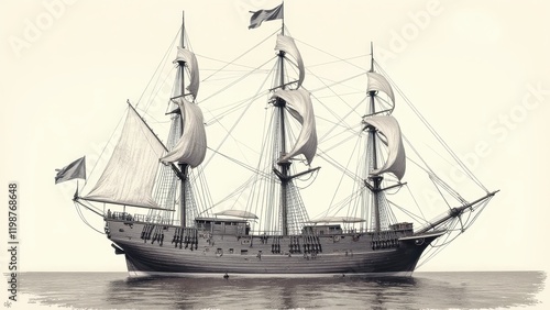 An awe-inspiring tall ship soars on ocean waves, its towering white sails billowing gracefully against the sky. Three majestic masts reach high as it cuts through the water's embrace