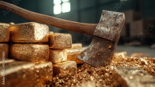 An axe is dramatically placed atop stacks of gold ingots, symbolizing wealth and power, amidst a golden dust atmosphere that captures the allure of precious materials.