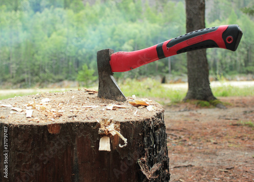an axe with a red handle in a chock