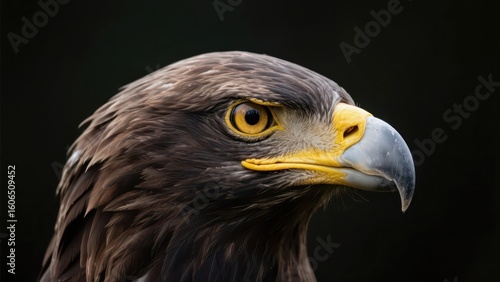 An eagle with dark - brown feathers on its head and a sharp look in its eyes is presented in a close - up shot, with a light - toned and blurred background highlighting its majestic expression.