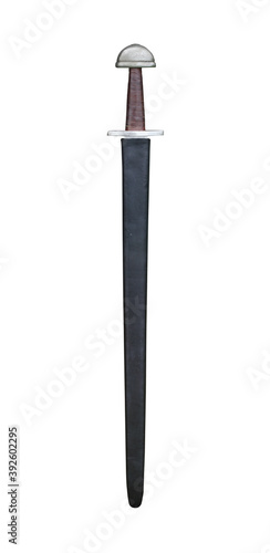 An early medieval sword in a black leather scabbard.