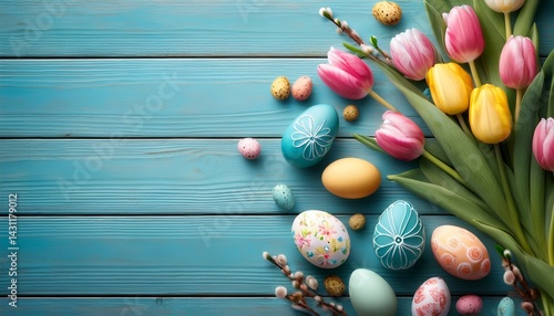 an easter setup with festive tulips and embellished eggs arranged on rustic blue wooden planks produced by modern