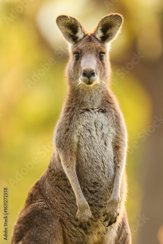 An Eastern Grey Kangaroo Stands on a Grassy Hill at Sunset in Healesville, Victoria, Australia