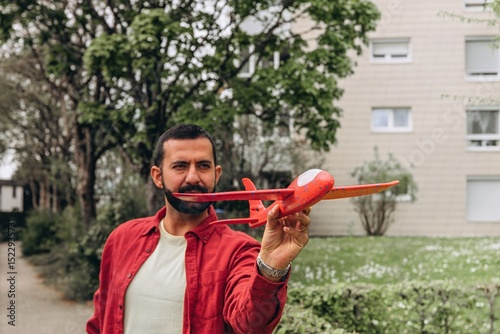 An Eastern man launching red toy airplane, enjoying playful and nostalgic moment outdoors.Concept of leisure, childhood memories, aviation.Ideal for themes like parenting, freedom,and simple joys