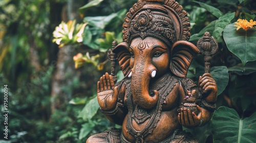 An eco-friendly Ganesha statue adorned with leaves and flowers, reflecting harmony with nature.