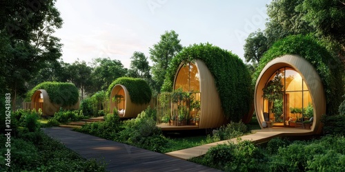An eco-friendly tiny home village showcasing sustainable living and innovative design in harmony with nature.