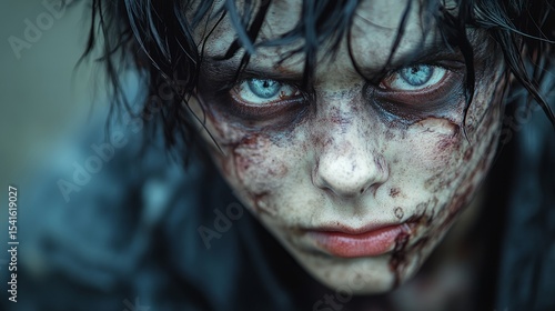 An eerie portrayal of a young figure with striking blue eyes, evoking a sense of intrigue and curiosity