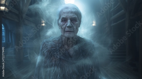 An eerie portrayal of an elderly woman as a ghostly apparition, haunting an ancient, mist-filled mansion.