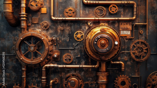 An elaborate steampunk background features a mesmerizing arrangement of gears, pipes, and mechanical components, evoking an industrial vibe.