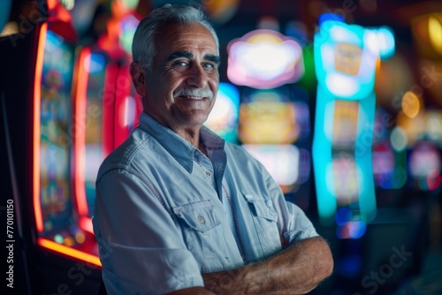 An elder man sits thoughtfully near bright colorful slot machines in the vibrant atmosphere of a casino