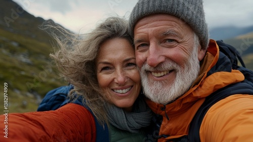 An elderly couple posing for a selfie during an outdoor adventure trip.