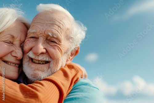 An elderly couple shares a warm embrace, smiling broadly beneath a bright blue sky. Their happiness reflects a life filled with love and cherished memories in nature.