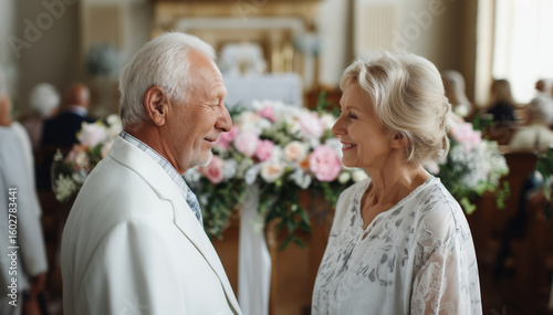 An elderly couple smiles at each other during their wedding ceremony, surrounded by family and friends.