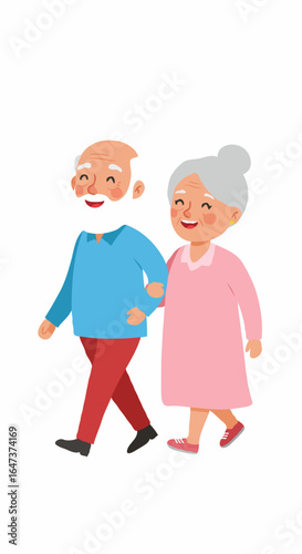 An elderly couple walking arm in arm. They look happy and content while enjoying a leisurely stroll together
