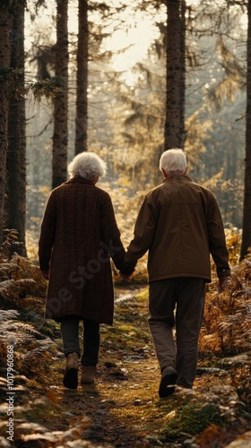 An elderly couple walks hand-in-hand through a serene forest path, surrounded by autumn foliage.