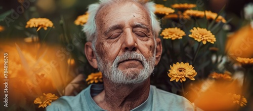 An elderly gentleman with a beard wearing a blue shirt stands in the midst of a vibrant display of yellow flowers