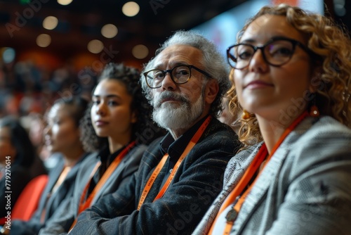 An elderly gentleman with a white beard engaged at a seminar, among a diverse audience