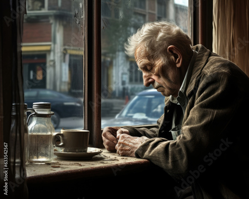 An elderly man alone at a caf? table looking forlornly out of a window.
