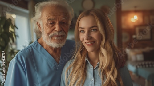 An elderly man and a young woman stand together, smiling warmly, depicting care and companionship in a cozy setting.