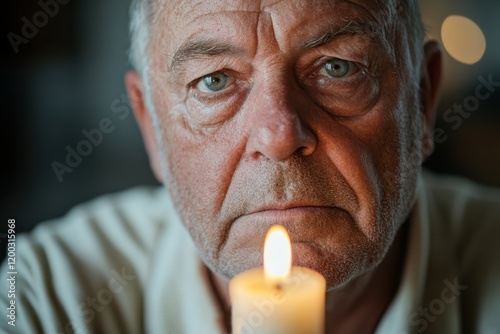 An elderly man gazes intently at a flickering candle, his expression revealing deep contemplation, conveying reflections on life, memories, and the passage of time.