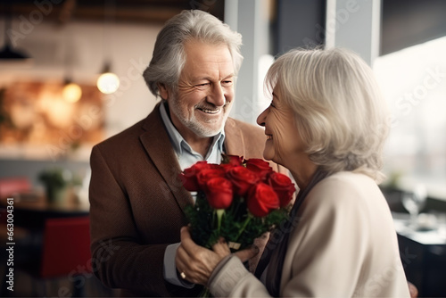 An elderly man gives an elderly lady, his wife, a beautiful set of red roses, a restaurant, a holiday, an anniversary, love.