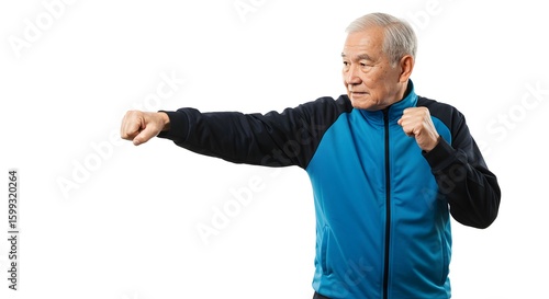 An elderly man in a fitness tracksuit mimicking a boxers jab on a white background