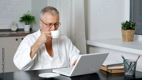 An elderly man in a housecoat is sitting at a computer.