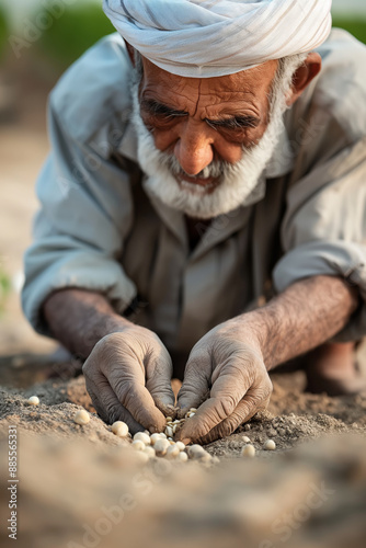 An Elderly Man Planting Seeds in the Soil of His Rural Farm