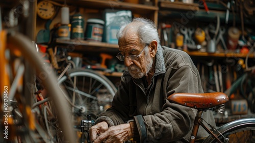 An elderly man repairing a bicycle in a well-organized workshop, his tools and spare parts neatly arranged. The hands-on activity and mechanical focus illustrate the satisfaction of maintaining and