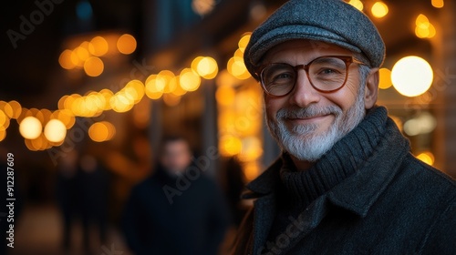 An elderly man smiles warmly while surrounded by soft glowing lights in the evening