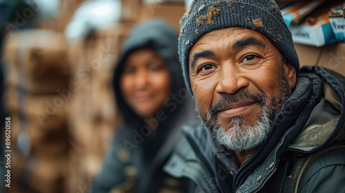 An elderly man warmly dressed in a winter coat and beanie smiles softly in an outdoor setting, capturing the essence of kindness and resilience in his weathered face.