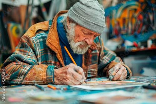 An elderly man with a beard draws while sitting at a table in an art studio, a pensioner's hobby