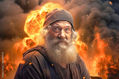 An elderly man with a long beard standing stoically before a roaring fire, reflecting on the destruction caused by war