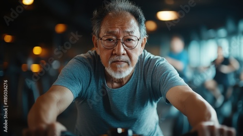 An elderly man with glasses exercises intently on a stationary bike, showcasing determination and strength in a modern gym setting filled with natural light and equipment.