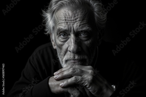 An elderly man with white hair and expressive eyes gazes thoughtfully, hands clasped together. The soft focus highlights his weathered skin, conveying a deep sense of experience and contemplation.