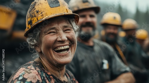 An elderly miner woman joyfully smiles, surrounded by supportive coworkers in orange gear at a mining site, symbolizing camaraderie and a lifetime of hard work.