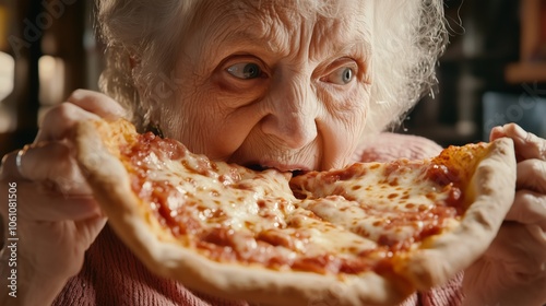 An elderly woman is joyfully enjoying a delicious slice of pizza
