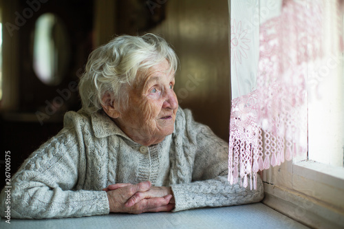 An elderly woman looks out the window sitting in his house. Care of lonely pensioners.