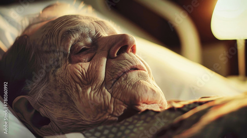 An elderly woman peacefully lies in a hospital bed with her eyes closed, lost in a serene slumber