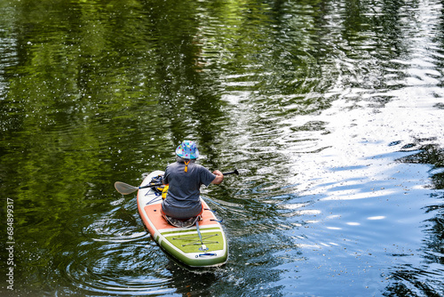 An elderly woman prefers an active lifestyle and exercises her muscles by paddling while riding a board on a forest lake