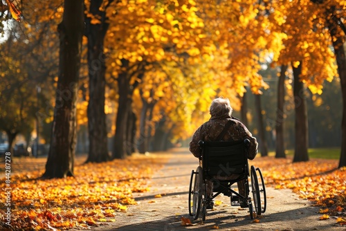 An elderly woman rides in a wheelchair in a fall park. A lonely old disabled female on a street strewn with yellow leaves.