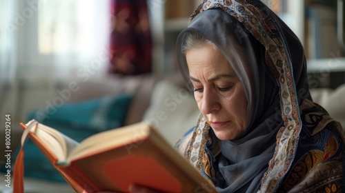 An elderly woman wearing a patterned hijab engrossed in reading a book seated comfortably in a cozy living room.