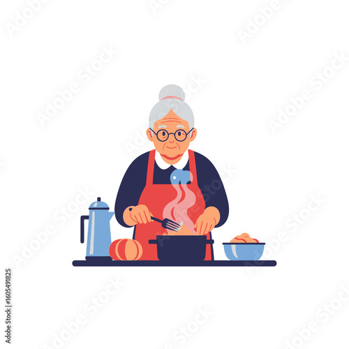 An elderly woman wearing an apron and glasses stirs food in a pot, with a coffee pot and bowl of ingredients nearby.