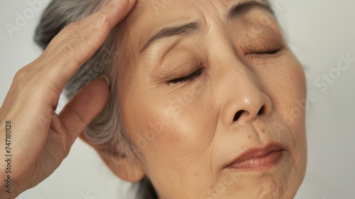 An elderly woman with closed eyes her hand gently resting on her forehead conveying a sense of relaxation or contemplation.